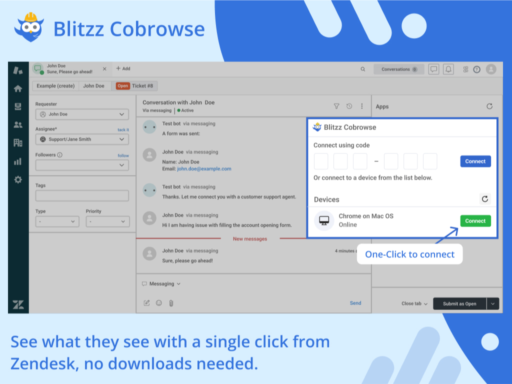 Blitzz helps you provide Remote Support to your customers using features like Cobrowse, Screenshare and Live Video integrated directly within apps you already use. Blitzz Cobrowse for Zendesk integrates right inside your Zendesk interface and allows you to instantly see what your customers see on your website or Mobile App in real time and guide them if they need help filling out a form or completing an order.