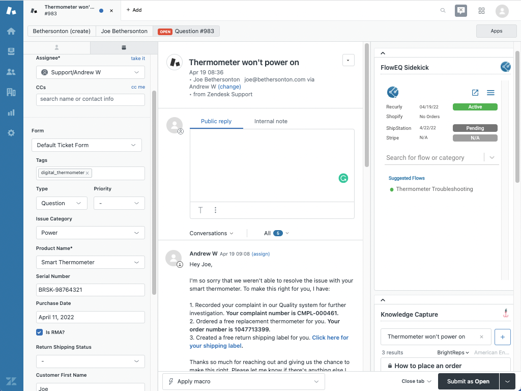 Whether it's returns / RMAs, order status inquiries, troubleshooting, or onboarding / offboarding, FlowEQ enables you to automate your team's most painful workflows and consolidate them down to a single interface using a knowledgebase of step-by-step instructions, decision trees, a customer 360, actionable context, and powerful integrations.