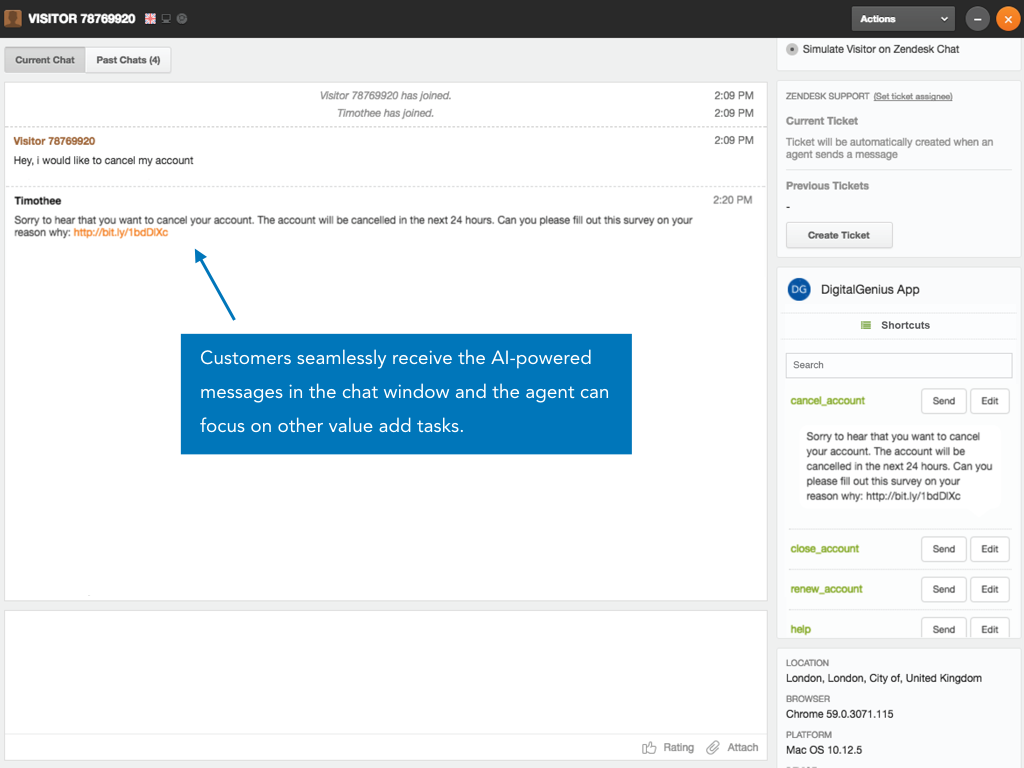 To install DigitalGenius inside Zendesk Chat, please reach out and ask to talk with our sales team.