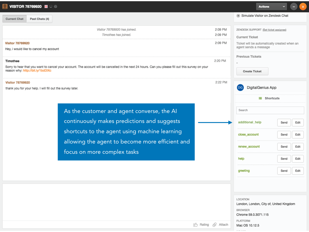 DigitalGenius is the AI platform that puts your customer support on autopilot by understanding conversations, automating repetitive processes and delighting your customers. The DigitalGenius AI platform is used by KLM Royal Dutch Airlines, The Perfume Shop, Air France and other forward-looking businesses to drive conversational process automation through the use of deep learning.