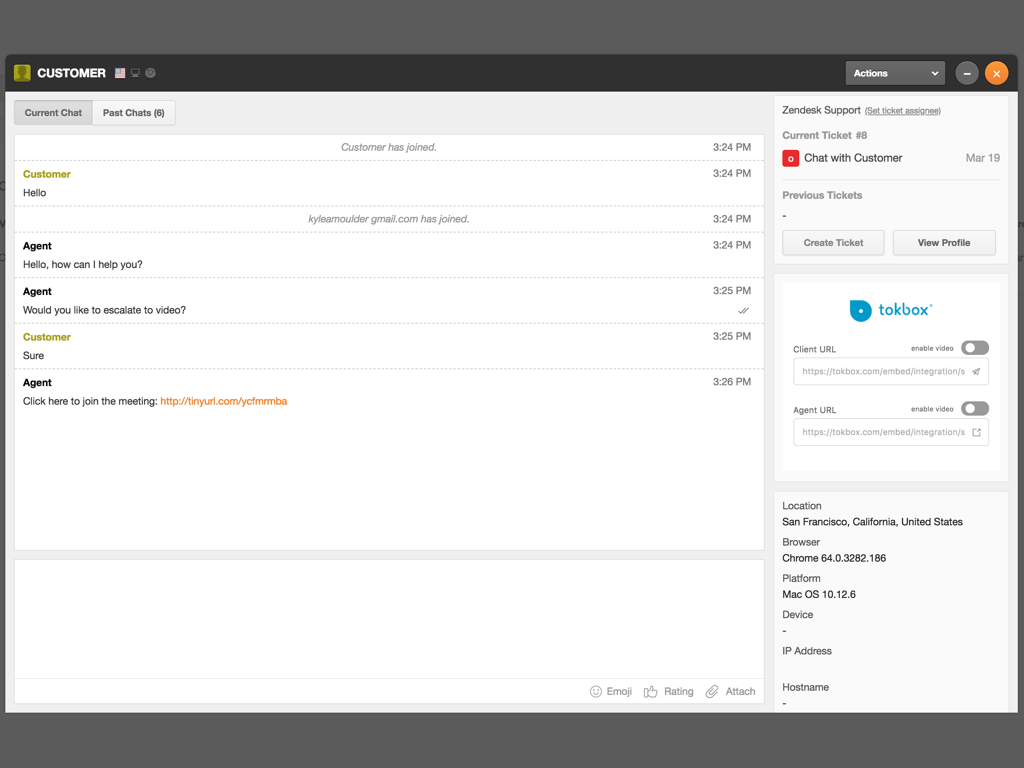 The TokBox integration for Zendesk allows agents to share a link to a live video and/or audio meeting, without leaving the Zendesk platform.