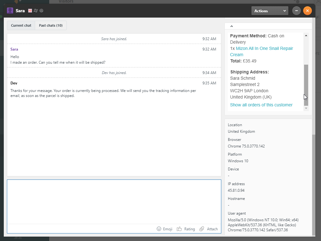 + When a customer starts a chat, you will automatically see your customer's last order details (based on his email address).