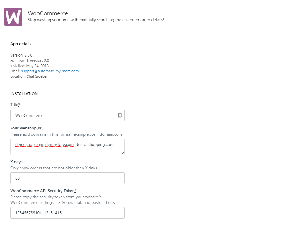 Now, paste this token into the Zendesk app settings 'WooCommerce API Security Token' field.