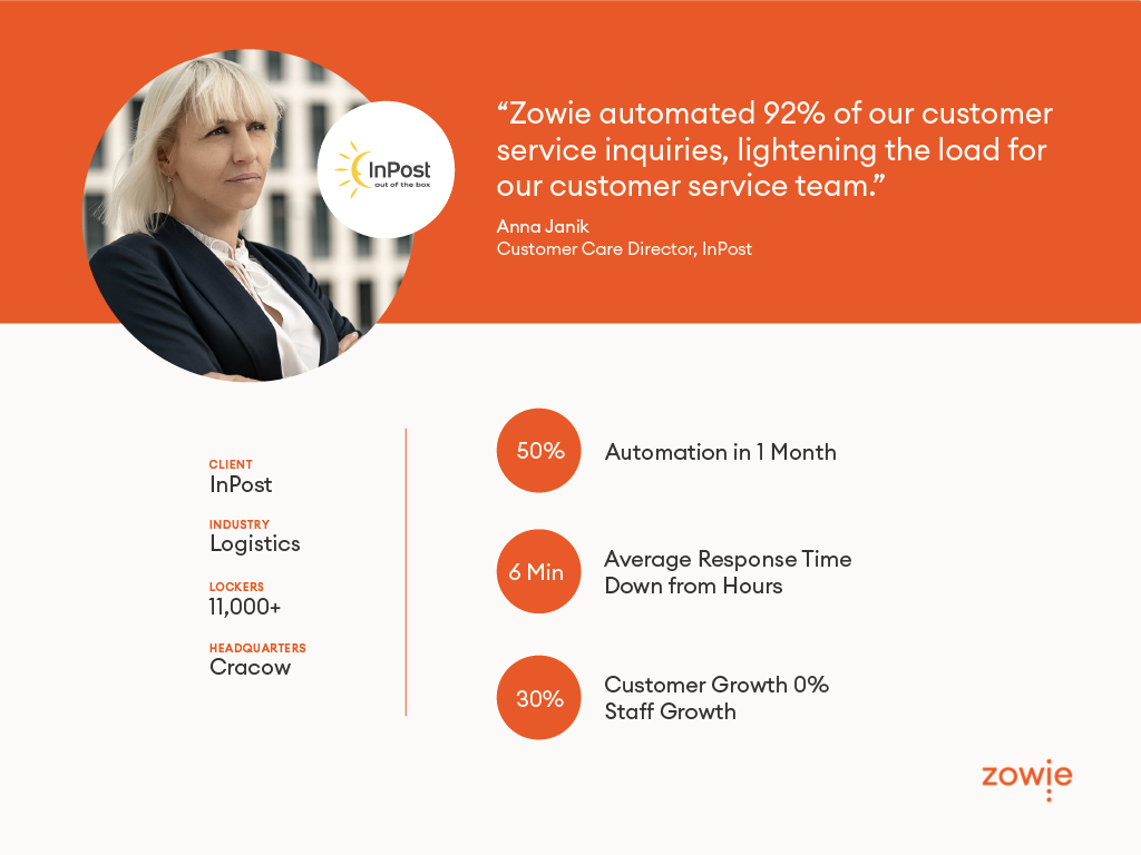 Zowie automates 32% of inquiries in 24 hours and 60%+ in a few weeks. Up your customer service game and become more efficient now, not in six months.