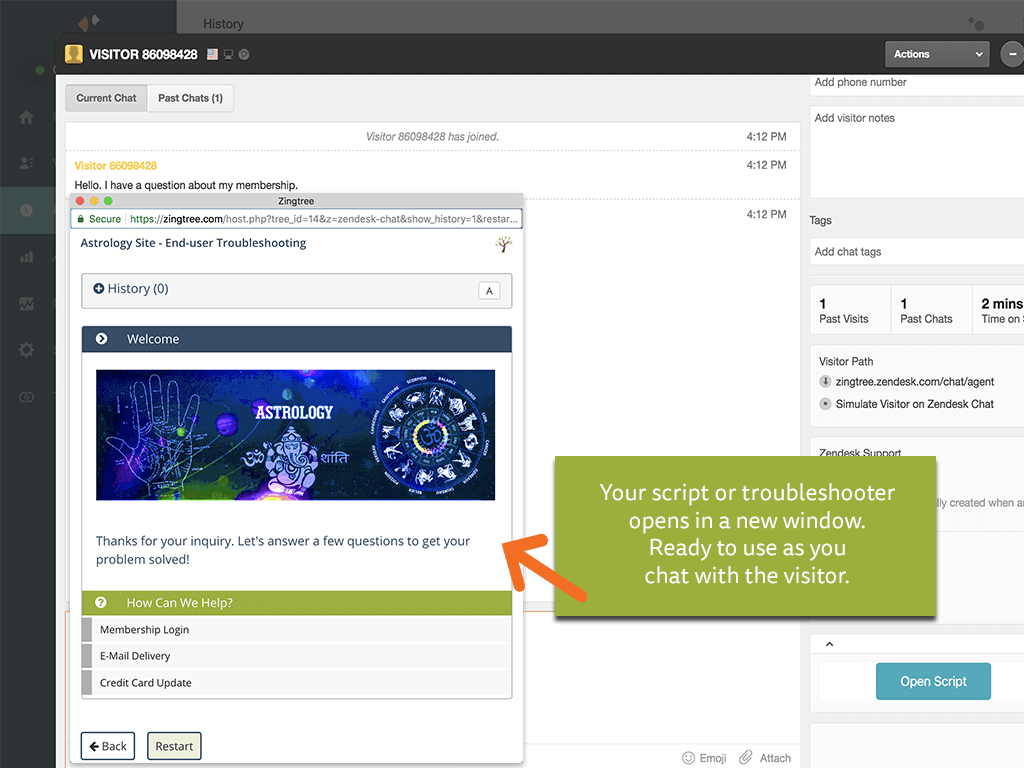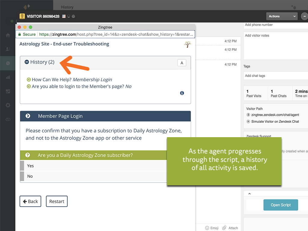 Pause and Resume: If a ticket is reopened, the script will reappear in the same state as it was previously, with the history intact. Agent Feedback: Clicking the orange chat bubble lets your agents submit comments, which are automatically sent to the authors of the tree. Your agents become a valuable part of improving your scripts. Automatically Choose a Script based upon Brand, tags or a custom field: When a ticket is opened, the Zingtree Agent Scripting app locates a script associated with the content of a ticket. Zendesk Tagging: Add a tag to any node using the Zingtree Edit Node tool. When that node is opened in Zendesk, the tag gets copied to the Zendesk tags for the current ticket.
