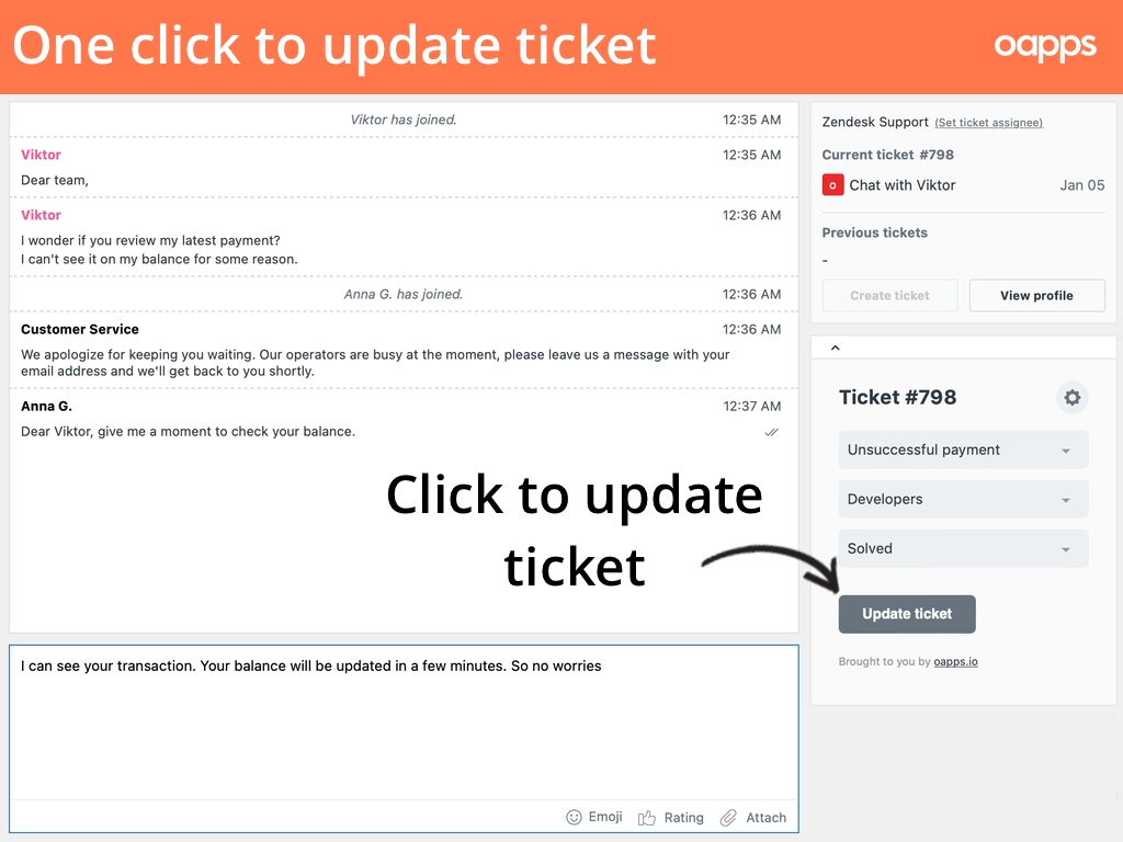 The app will boost your agents' productivity by allowing them to change ticket status, group, or set custom fields of chat tickets without leaving the chat.