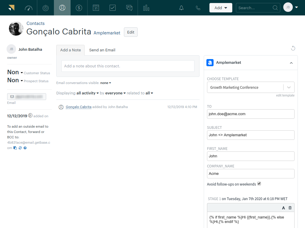 Amplemarket seamlessly integrates with your email inbox and Zendesk Sell allowing you to do things like trigger email cadences directly from a contact page on Zendesk Sell.