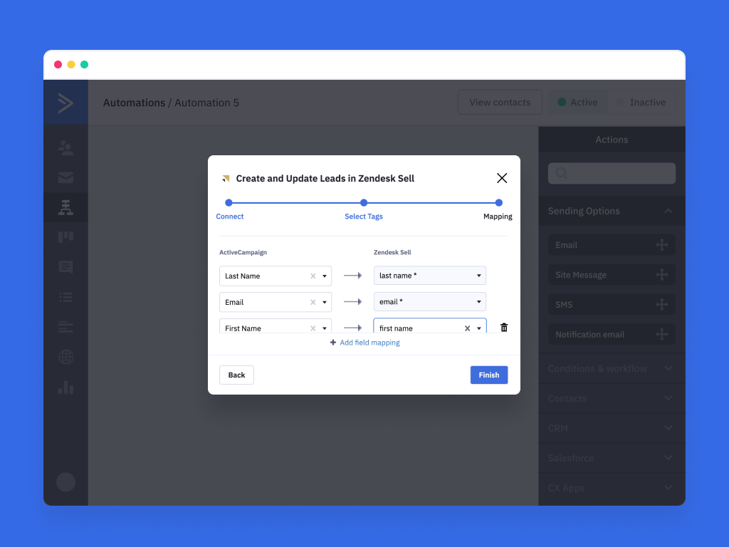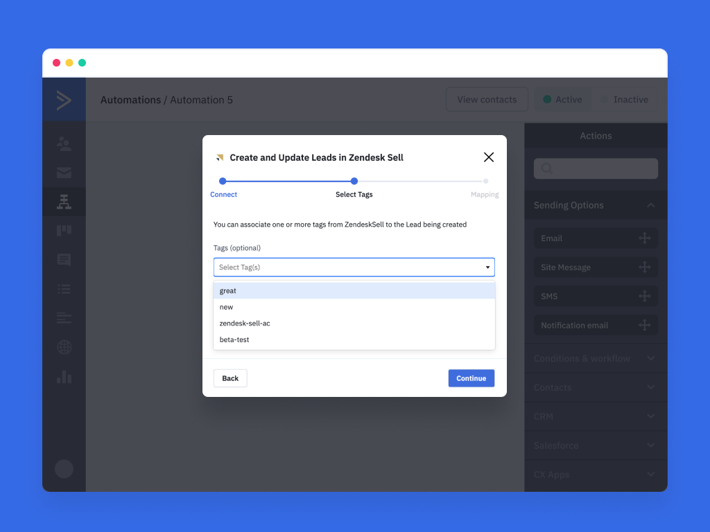The Zendesk Sell app uses the "Create and update leads in Zendesk Sell" automation action to sync contact information from ActiveCampaign to Zendesk Sell. Once you add this action to your automation, a prompt will walk you through the connection and configuration steps to send ActiveCampaign contacts to Zendesk Sell as leads