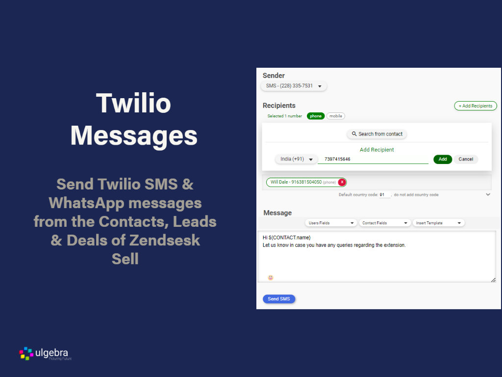 Bulk Messages: Click on the Twilio icon on the top panel of Zendesk Sell. Click on 'Send Twilio Message'. Select your Twilio Sender. Click on 'Add Recipients'. Select the country code, enter the contact number and click on Add. Similarly, multiple numbers can be added to send bulk message. Enter the message or insert a template. Send the message.