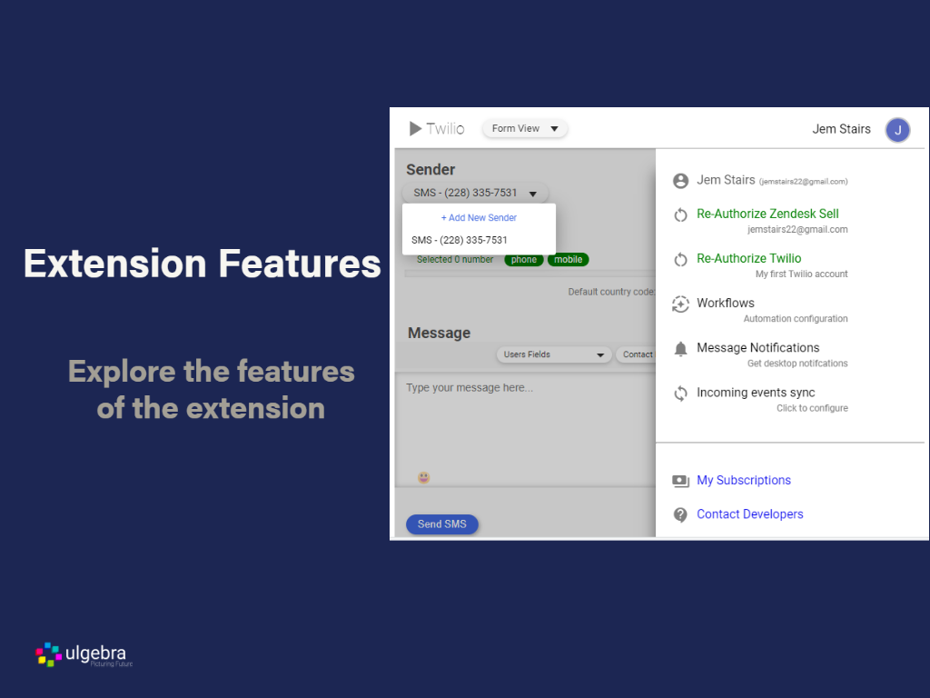 Desktop Notifications: Click on your profile within the extension interface. Select 'Message Notifications'. Enter the email id of the user for whom you wish to enable desktop notifications for your incoming Twilio messages and click on 'Add User'. The user must have an Ulgebra account under the same email id. Share the link received with the user. The user must acces the link on their browser and sign in to Ulgebra using the entered email id. Click on 'Start Receiving notifications on this browser'. This way you can enable multiple users to receive desktop notifications for your incoming Twilio messages.