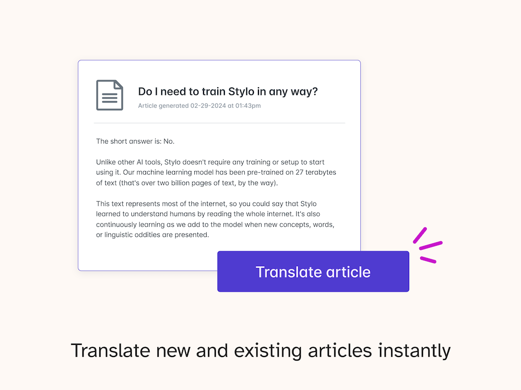 Break language barriers by localizing articles into various languages. Stylo Scribe effortlessly fills the gaps in your help center, making sure no customer is left without support in their native language.