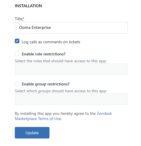 On Zendesk, install Ooma Enterprise from the Marketplace
