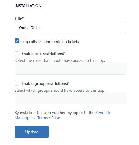 On Zendesk, install Ooma Office from the Marketplace