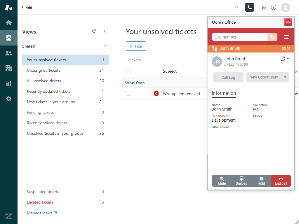 Ooma Office integration for Zendesk Support provides an embedded CTI client, allowing users to manage and streamline their communications – all from within the Zendesk UI.
