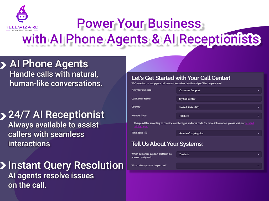 TeleWizard seamlessly integrates with Zendesk to revolutionize customer service with AI phone agents. These AI receptionists answer calls instantly, automate ticketing, and resolve customer inquiries 24/7—ensuring every call is handled efficiently. Whether during peak hours, after-hours, or for global support, TeleWizard delivers fast, human-like interactions without the wait.