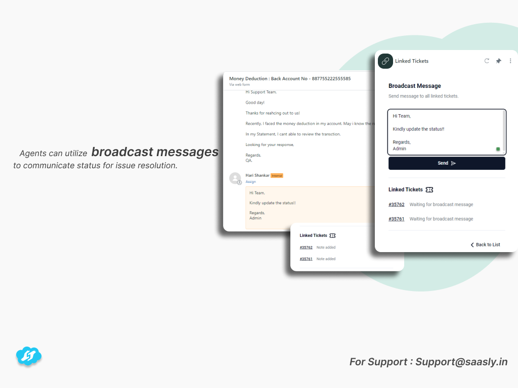 Efficiently manage and track tickets collectively, ensuring quick and consistent updates via broadcast messages to keep agents informed.Scenario: