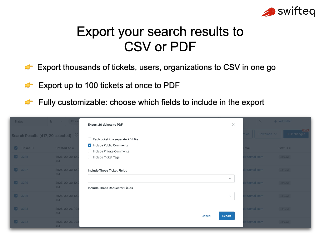 Export search results or tickets to CSV for analysis or download them as PDFs to share with your team or customers.