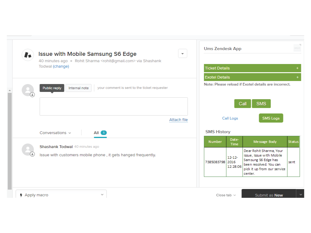 UMS' Exotel Telephony App comes with features which helps your business by improving Agent’s productivity and provides you with CTI (Computer Telephony Integration) records within Zendesk for tracking, monitoring, auditing and training purposes. Comes with 15 days of free trial. Key Features: -Click to call -Call History -Click to SMS -SMS History -Incoming call popup with caller ID/ caller details -Create new tickets while on a call.