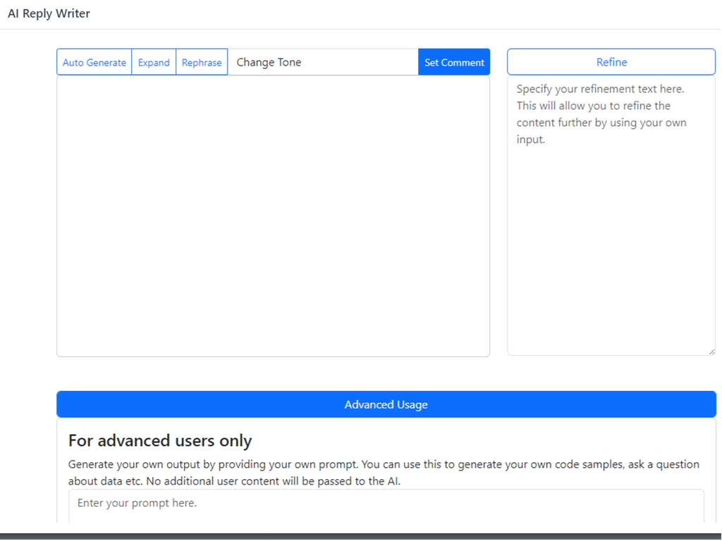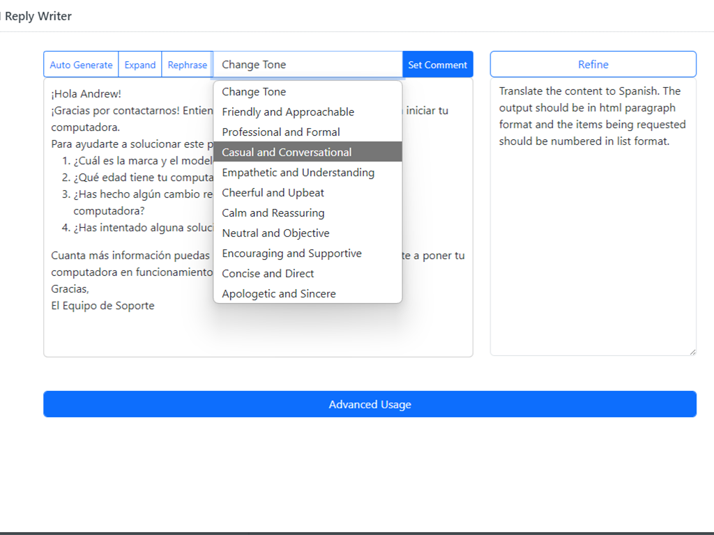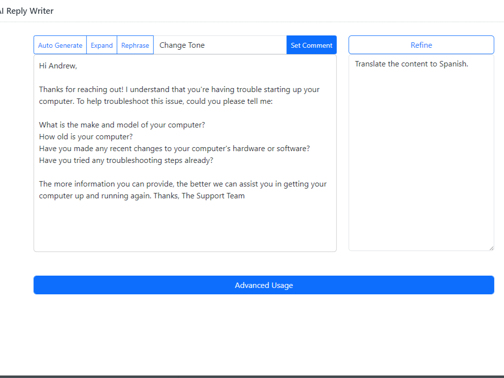 The applications are endless for this great app that takes advantage of modern AI models to enhance the output to your valued customers. The app is great for small or large teams and for those agents that English may not be their native language. Explore all the possibilities of AI with the AI Reply Writer app!