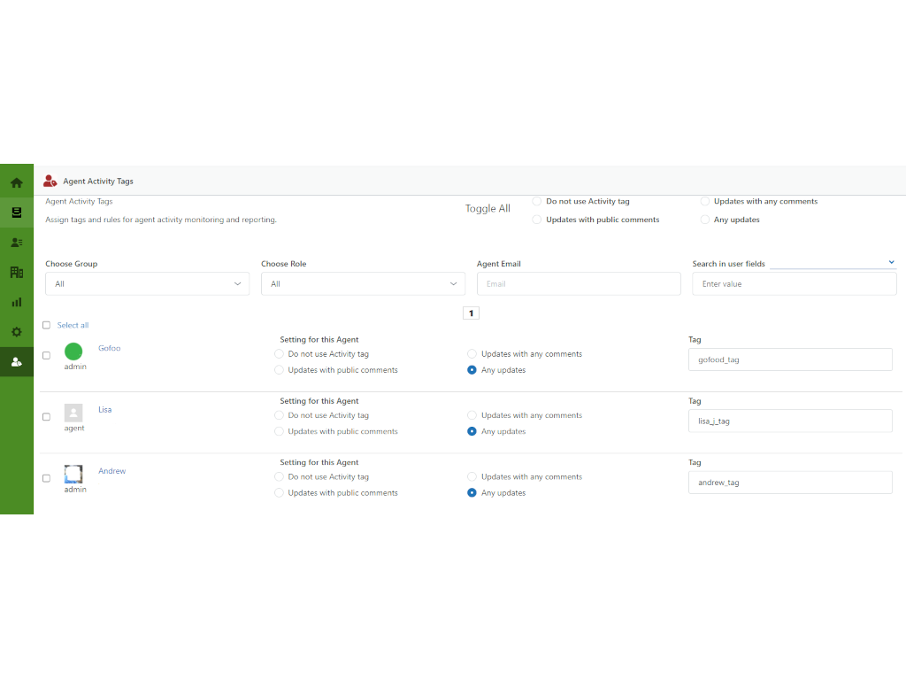 Update 2.0.0: Adds advanced filtering options, including custom user field filtering. Bulk update options now allow setting a single tag to multiple agents and setting the activity level option based on the currently shown agents.