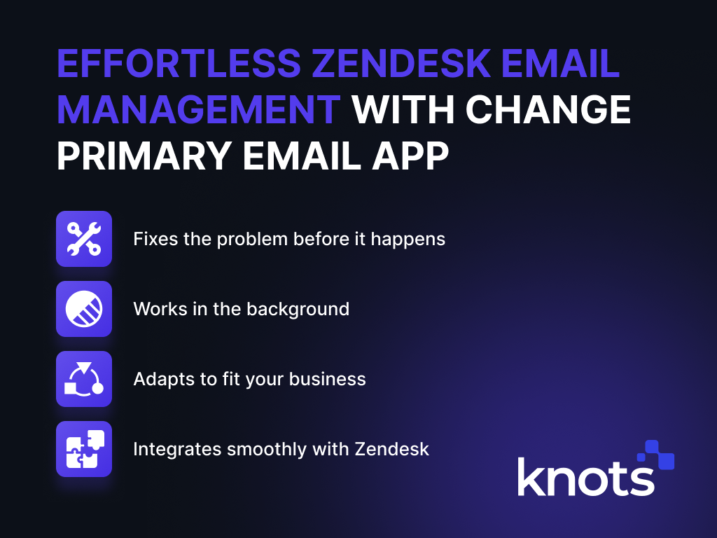 Automatic Email Matching: Detects the email address your customer used and ensures your reply goes back to the right inbox. Your agents won’t need to manually adjust the Zendesk email configuration—Change Primary Email takes care of it, allowing your team to focus on solving customer problems, not managing emails.
