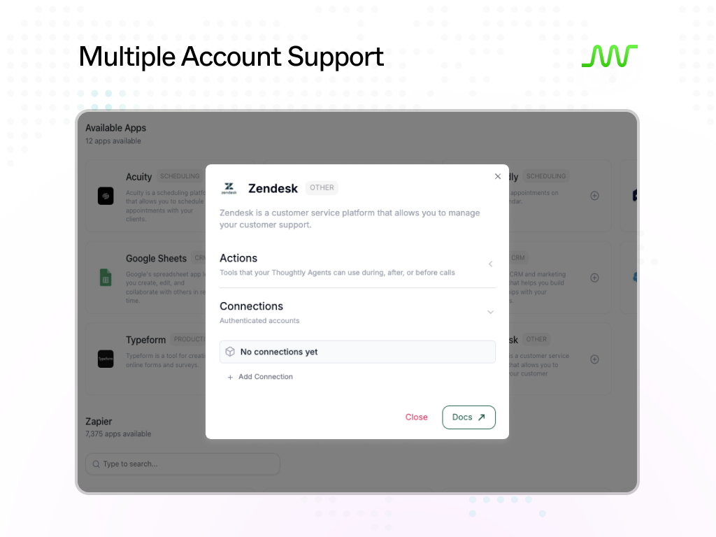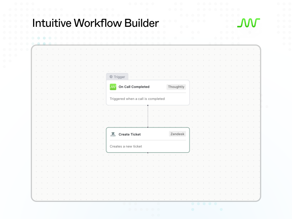 - Seamless Integration: Easily connect Thoughtly’s platform with Zendesk, enabling your support team to handle calls and tickets within a single, unified interface.