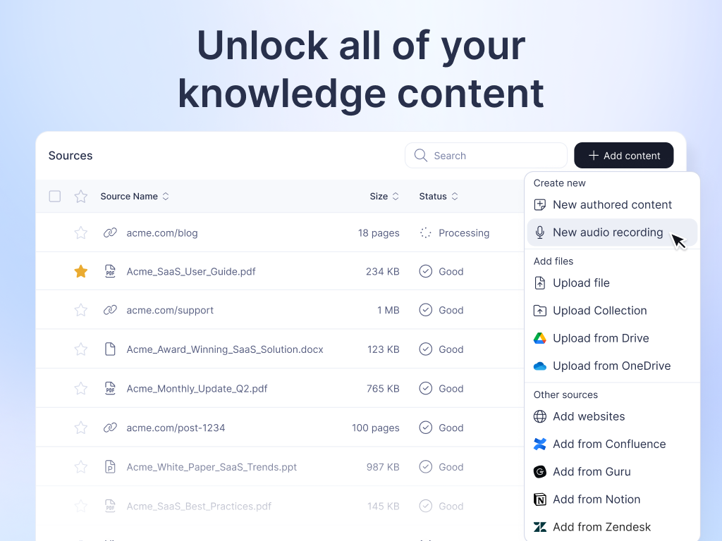 - Pre-built integrations to Zendesk Knowledgebase/Guide, Confluence, Notion, Google docs, and more.