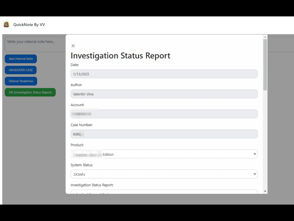 • Investigation Status Reports (ISR): Enables the creation of detailed ISR forms, capturing comprehensive information such as system status, actions taken, and next steps.