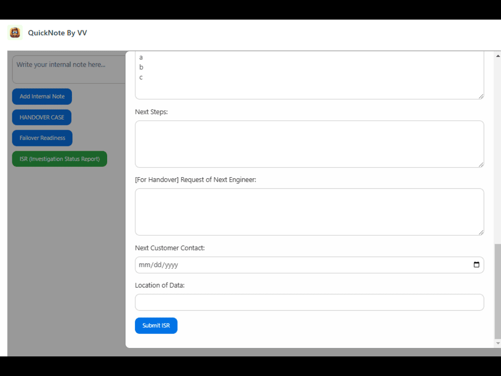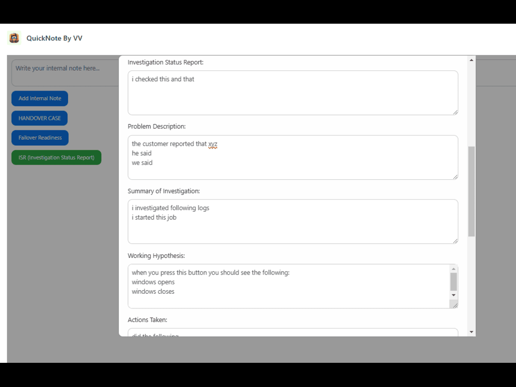 • Handover Management: Facilitates seamless case handovers with structured forms capturing problem descriptions, investigation summaries, and severity levels.