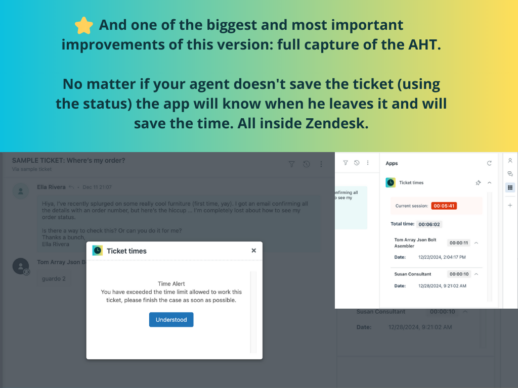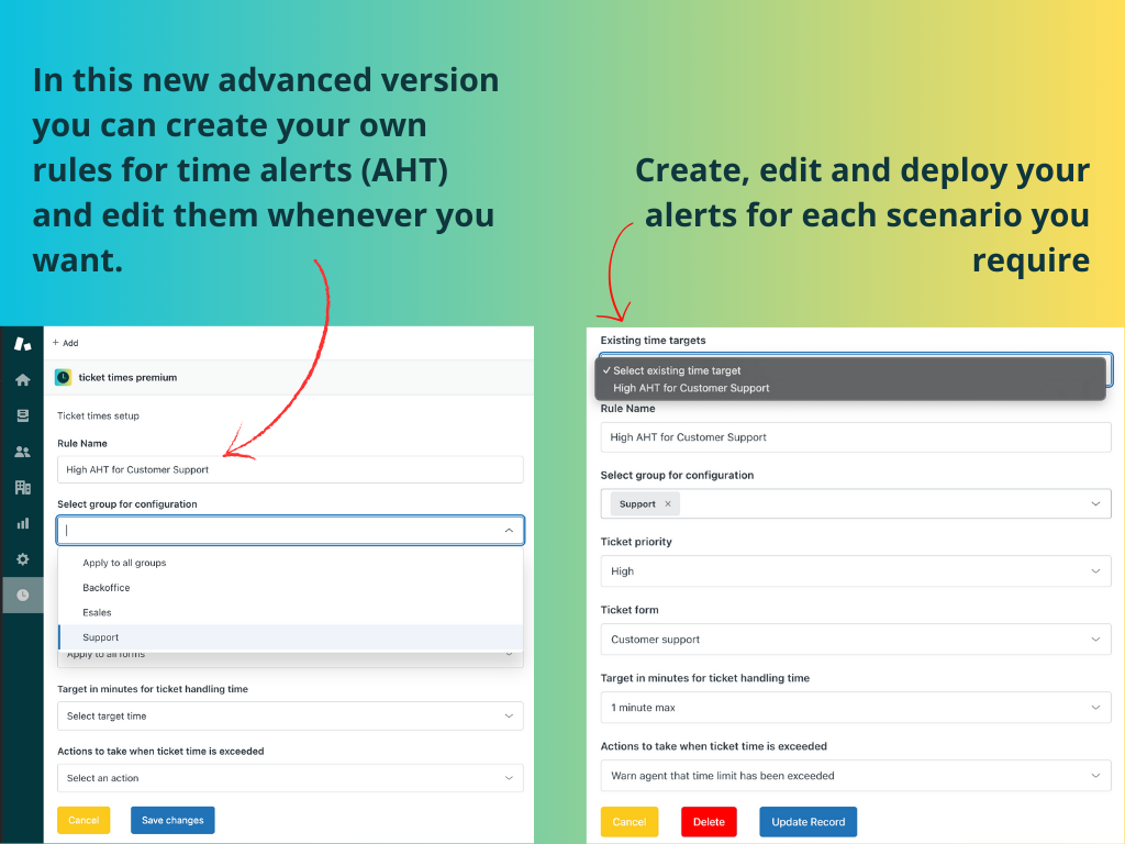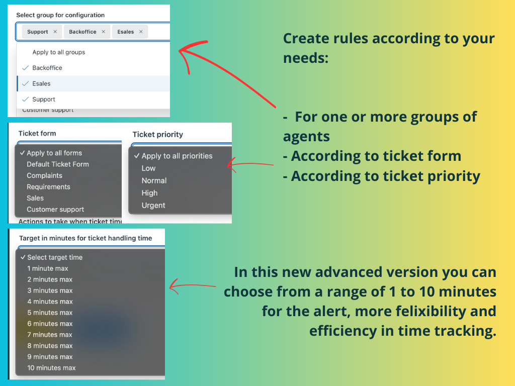 Exclusive Features:- Unlimited creation of custom time targets- Time rules based on multiple criteria: • Specific agent groups • Ticket form types • Priority levels- Automatic AHT (Average Handle Time) capture without depending on ticket saves- Extended time target configuration range (1-10 minutes)- Advanced productivity dashboard for managing multiple rules