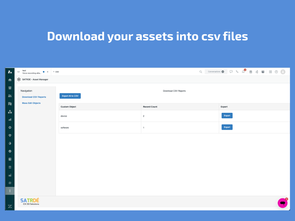 The SATRDÉ Asset Manager is designed to work with the latest version of custom objects. Simply setup custom objects, download into csv files one at a time or all at once. Additionally, there is a ticket sidebar component that will work with displaying assets tied to the ticket requester. All you have to do is setup your custom object with a customer look up relationship field.