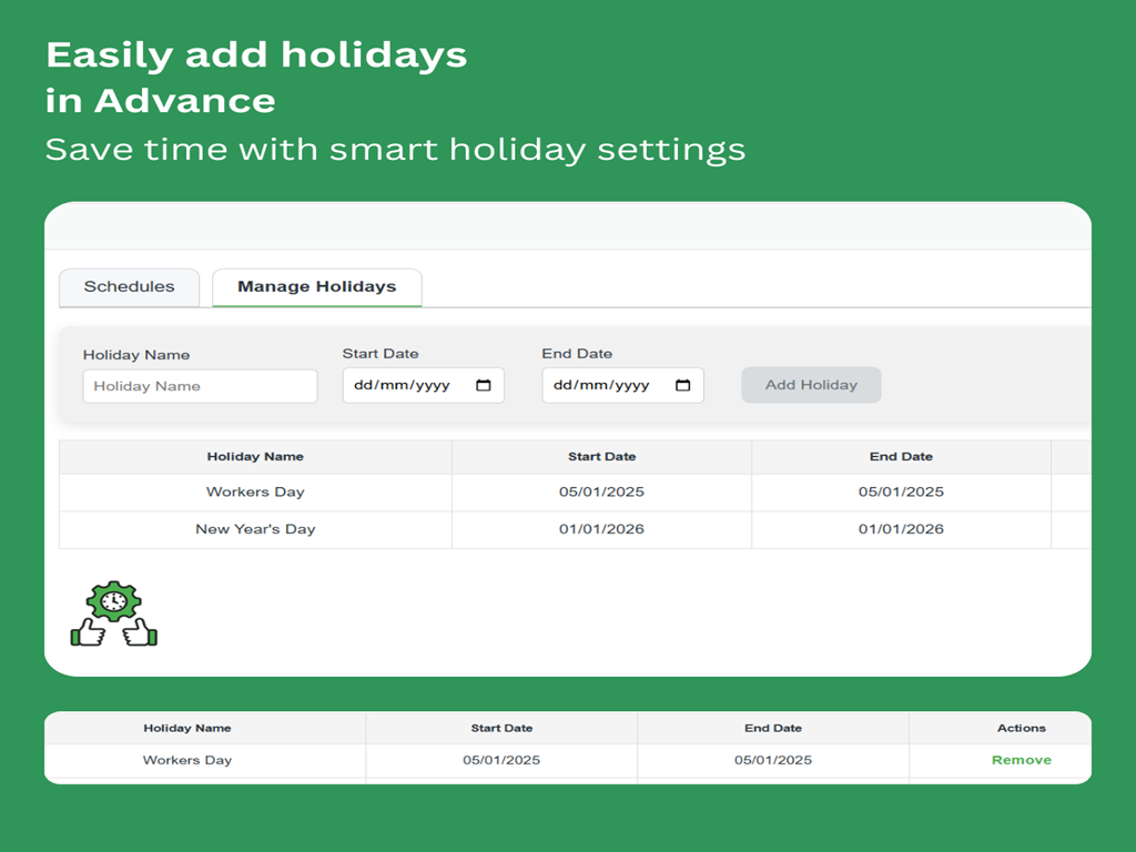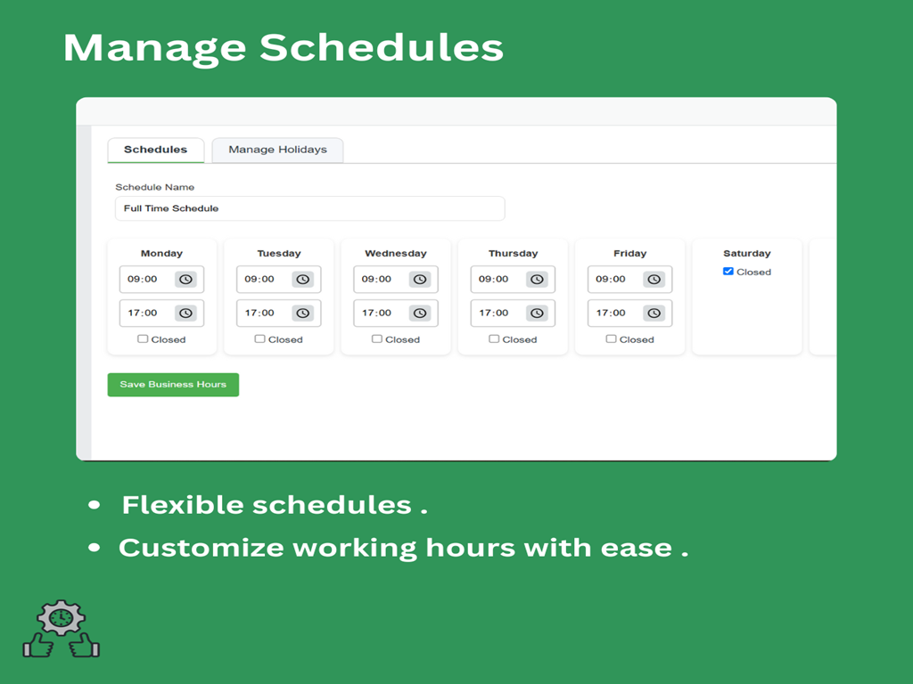 As part of this tool, you can easily define your team’s business hours and holidays, ensuring SLAs are measured accurately based on actual availability. Set it once, and let the app automatically adjust for holidays and off-hours.
