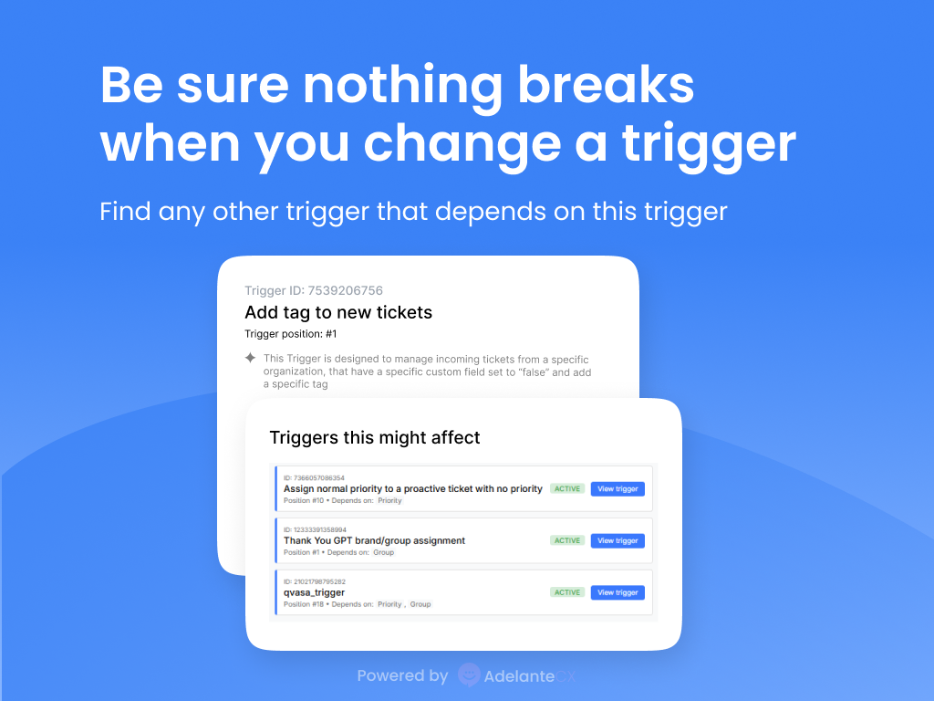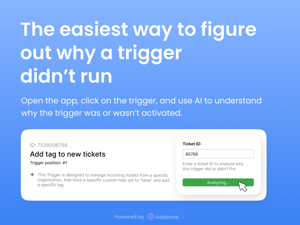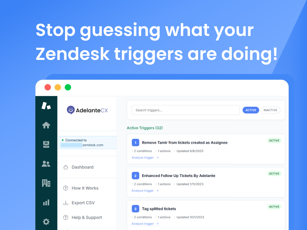 Trigger Analyzer is a tool by AdelanteCX, a Premier Zendesk partner. We create effective, secure and enterprise ready apps that leading support teams use.