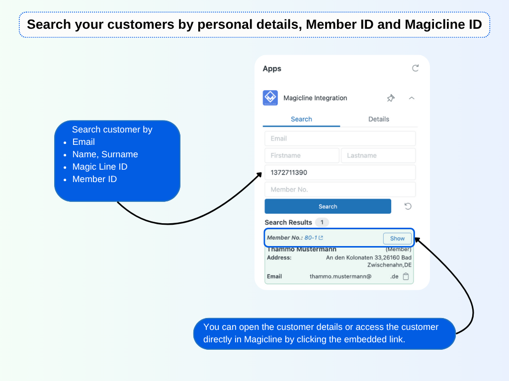 Search for customers by email, name, surname, Magicline ID, or Member ID