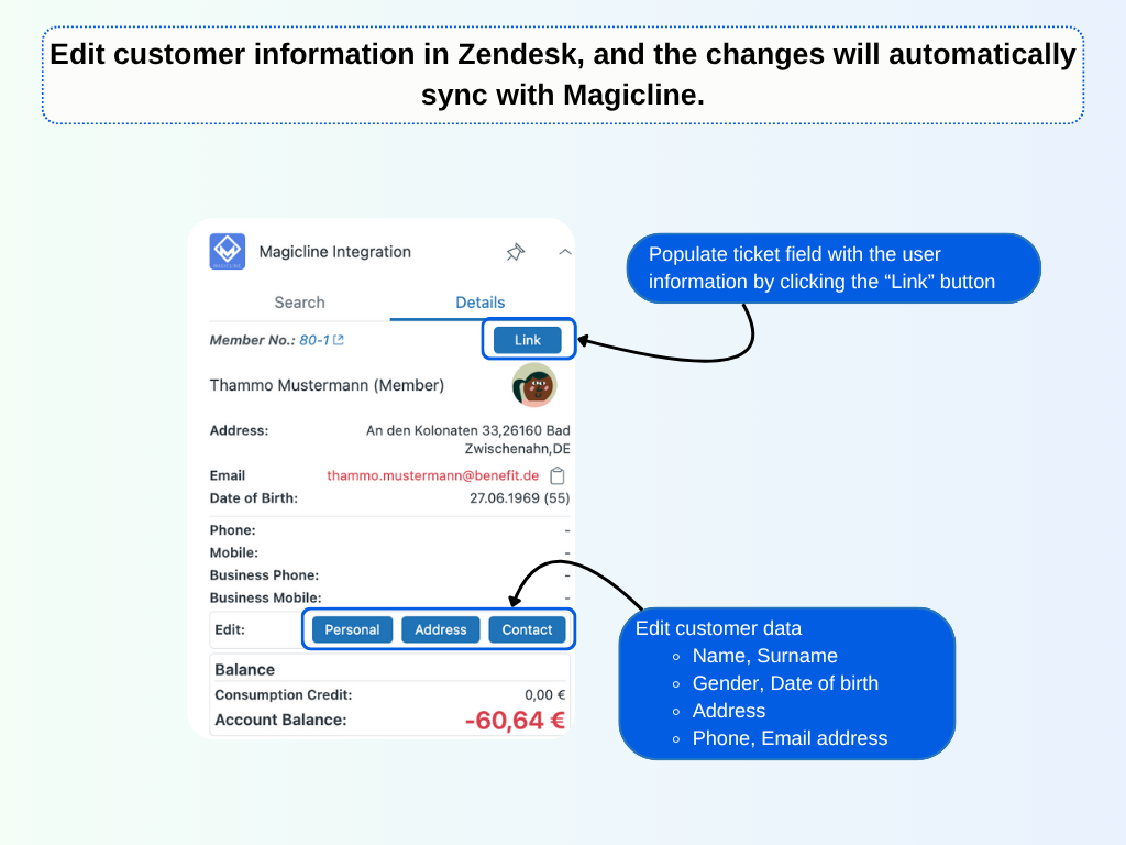 - Seamless data sync: Edit customer info in Zendesk and automatically update it in Magicline, no manual double entry.