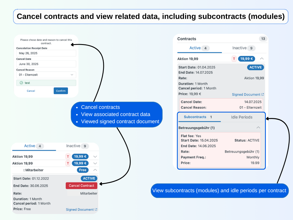 - Integrated contract management: Cancel contracts, view subcontracts (modules), signed documents, and idle periods without leaving Zendesk.