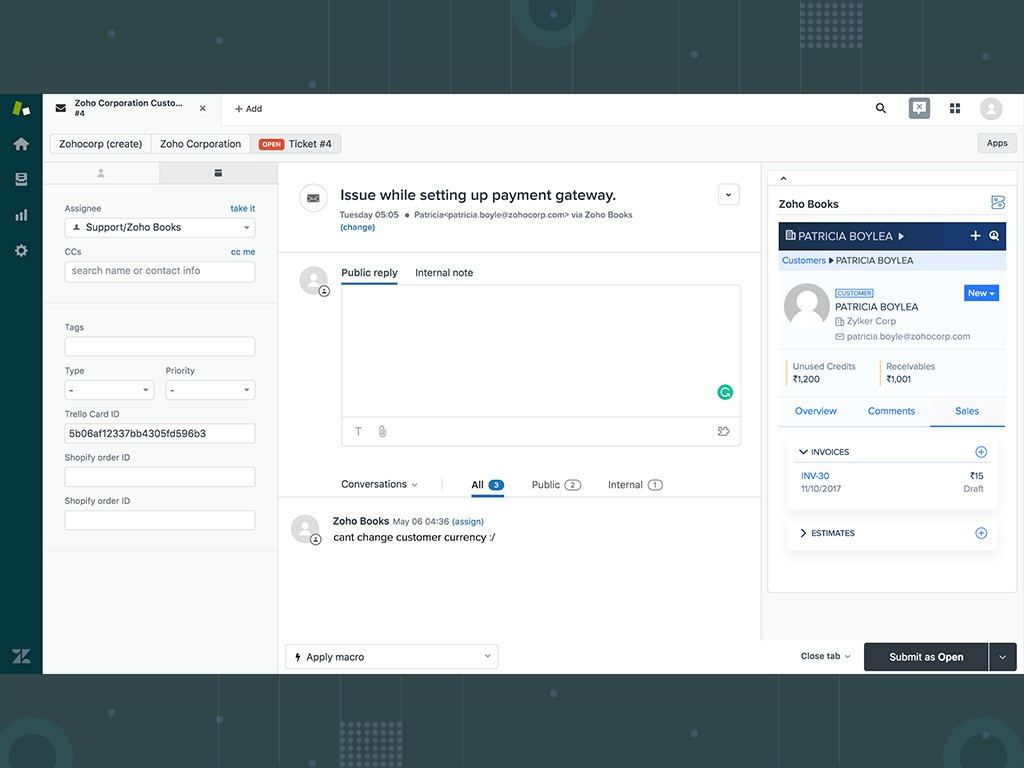 Get access to key account data of your customer with Zohobooks' Zendesk app.