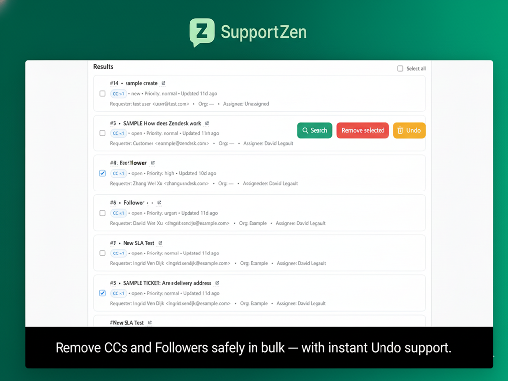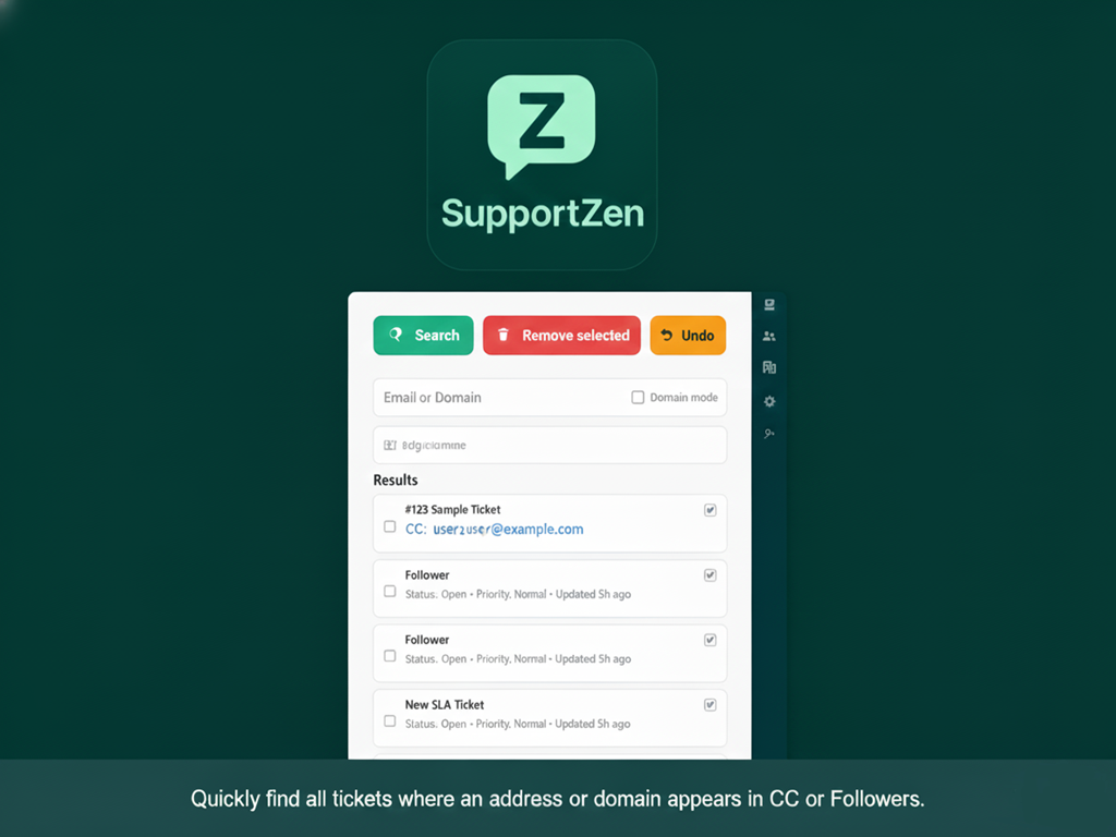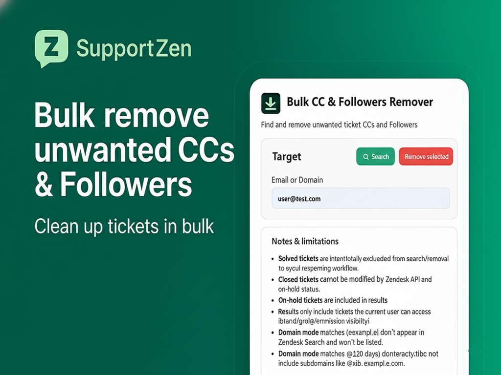 Managing CCs and Followers one ticket at a time is slow and error-prone. Bulk CC & Followers Remover gives admins and agents a safe, efficient way to clean up tickets at scale.