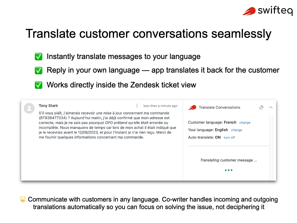 Agent Co-writer is developed by Swifteq, a Zendesk tech partner that builds apps to help support teams do more with less.