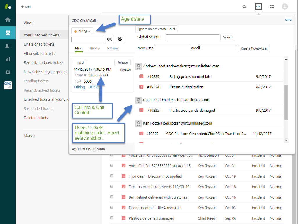 The CDC Platform with Zendesk and Microsoft Teams telephony connectors provides integration between your Microsoft Teams telephony system and your Zendesk environment. The platform supports searching, displaying, and creating Zendesk items based on the call data associated with a voice call. Leverage the information collected within your IVR, Voice Portal, ACD, databases, and web services to 'Screen Pop' the agent's Zendesk session with new or existing Zendesk users, tickets, and more.