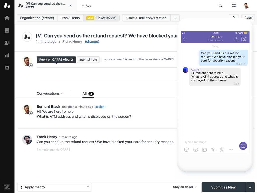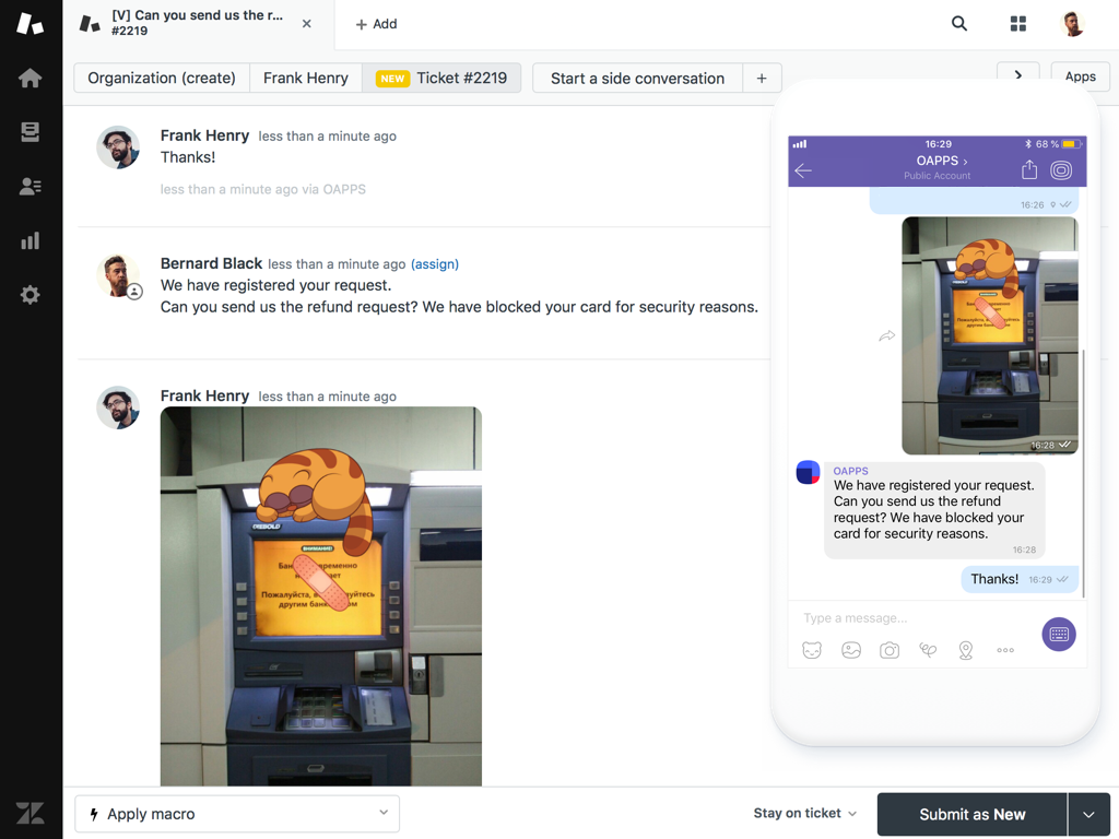 Engage with you Viber™ users via Zendesk Support. Unleash the full Zendesk power - use macros, triggers and ticket assignments the same way you used to work with e-mails.