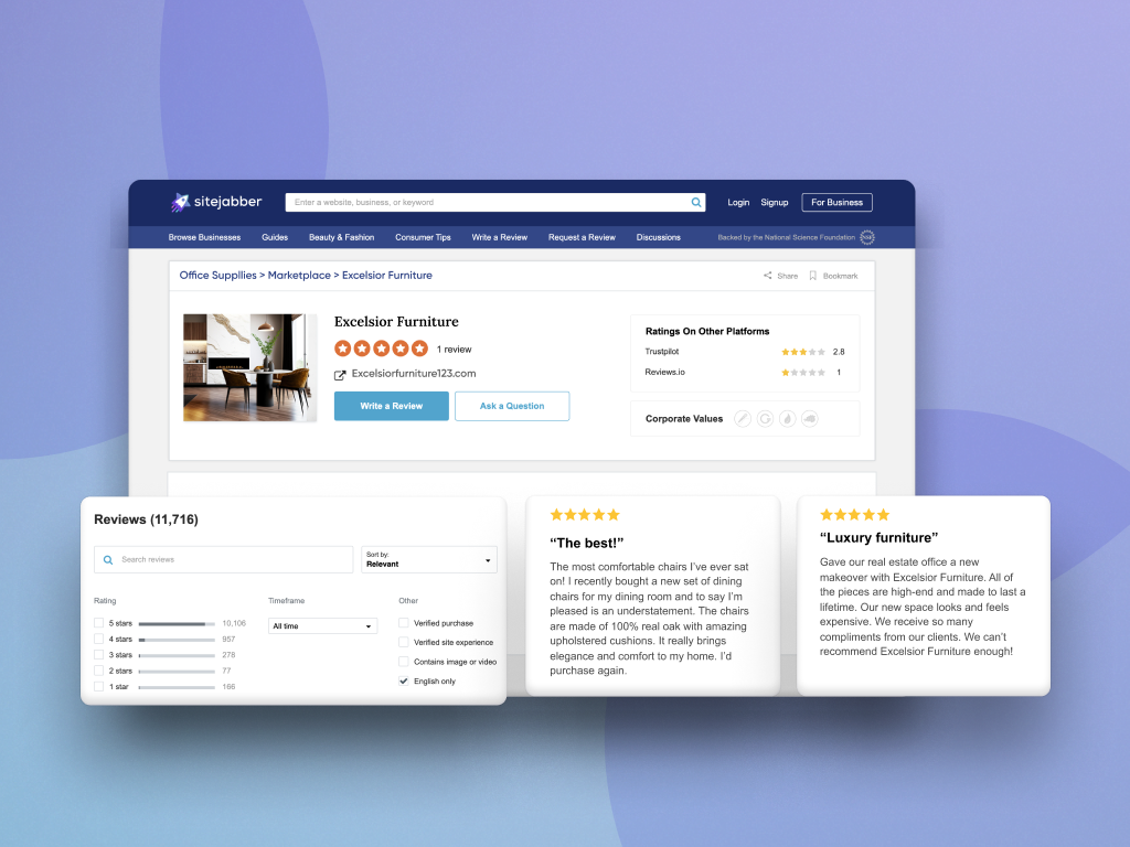 Over 40,000 registered organizations use Sitejabber to manage and promote customer reviews of their company and products – thereby showcasing their value, obtaining actionable feedback, and driving measurable customer growth. Sitejabber is also the only review platform to be both funded by the US government’s National Science Foundation and an official Google review partner.