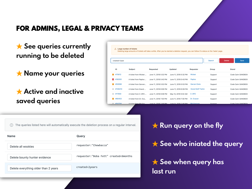Search query based usage makes sure only the information that needs to be deleted gets deleted. It also allows for relative time based operations, or selections of tickets and users.