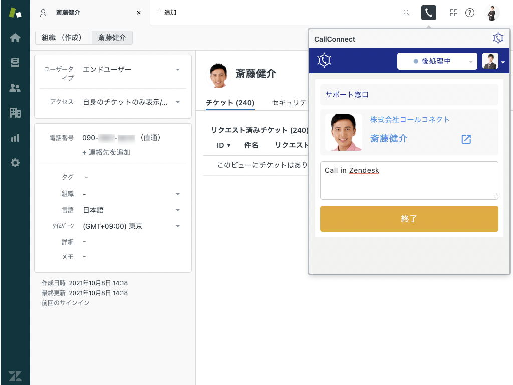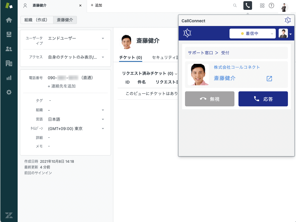 通話を開始するとZendesk内から電話番号の一致するユーザーを探し、自動で該当顧客のページが表示されます。過去のチケット対応履歴を確認しながら、スムーズな電話対応が実現できます。また、CallConnect内でZendesk連携をしていれば、通話時のメモや録音データがZendeskチケットとして自動作成されます。