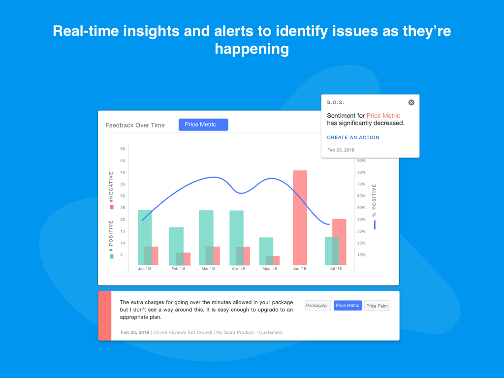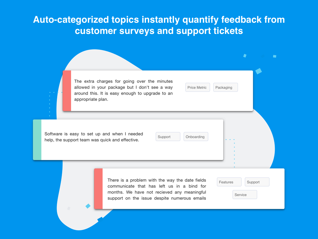 It's our mission to reduce reliance on expensive surveys by extracting meaningful insights from places where customers are already telling companies what they need on a daily basis (places like support tickets, sales opportunity notes, and online reviews), so customer success and marketing leaders can proactively identify issues impacting customer retention and satisfaction, and pivot company initiatives to address them.