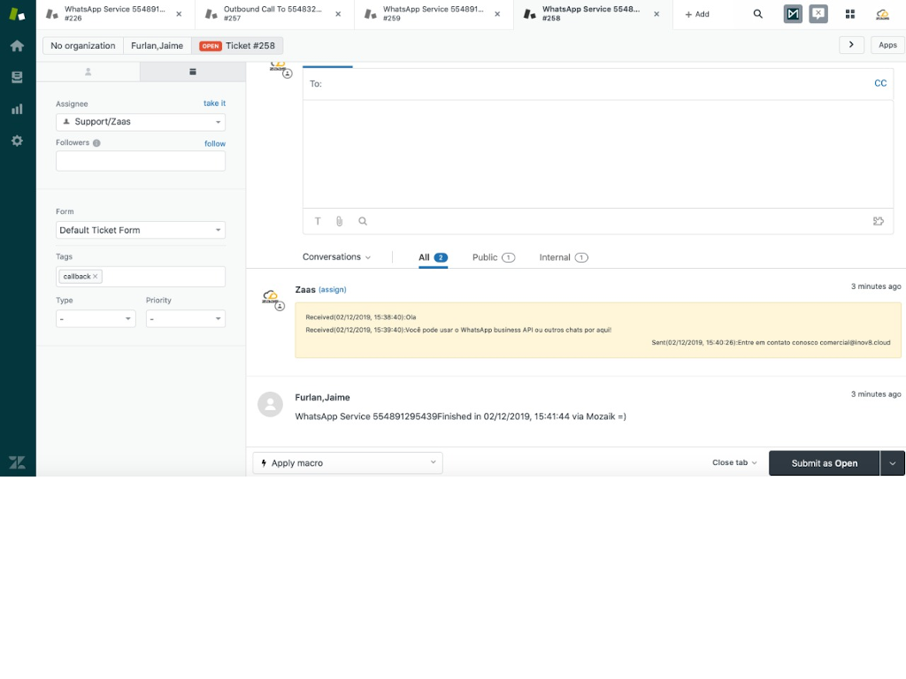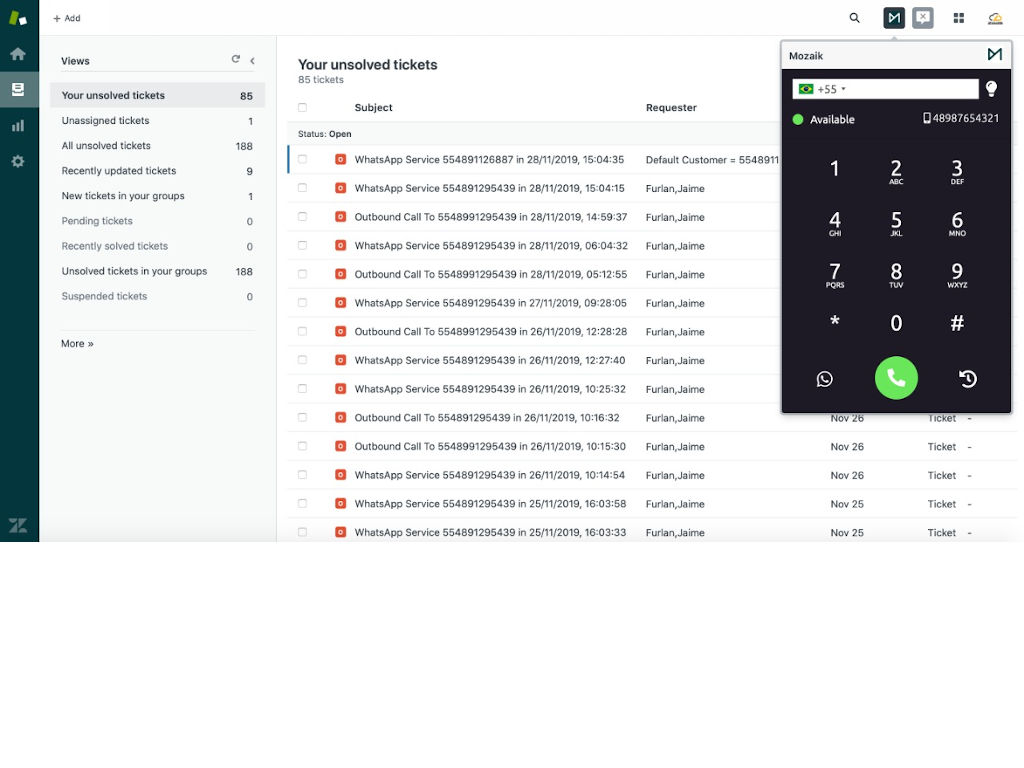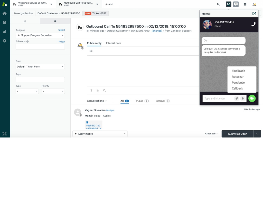 Communicate via WhatsApp Business, voice, email and chatbots without losing contact history and transform your customer's experience.Use the PABX that delivers the best call's quality on the market. Optimize your service using Whatsapp and other chat media in the same application, as well as trigger SMS. All activity logs and recordings are saved inside Zendesk tickets!
