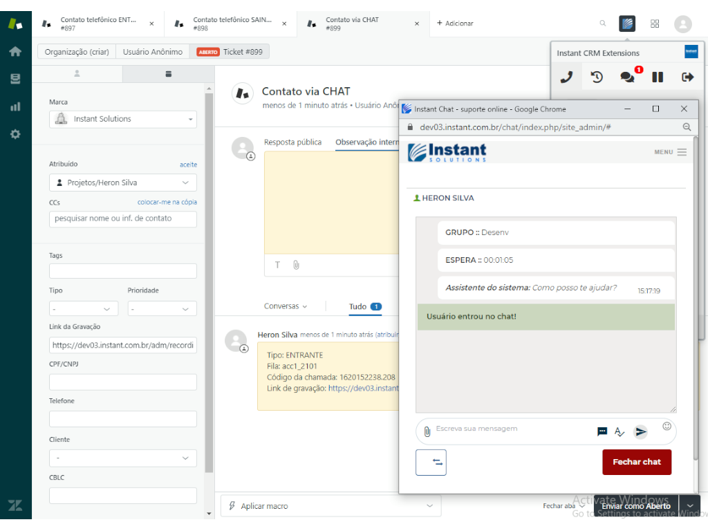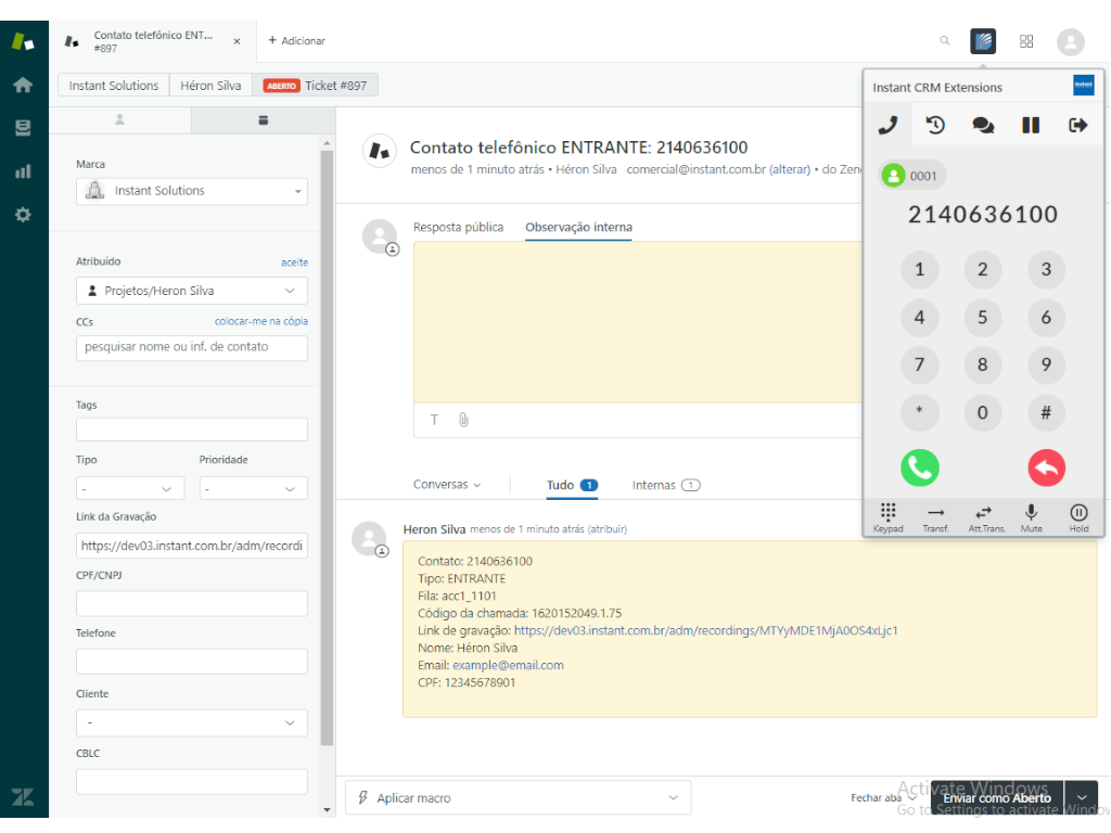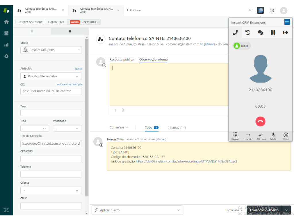 Para chamadas entrantes e saintes, tickets são criados automaticamente, contendo as informações de CTI da chamada e o link para a gravação de áudio. Os tickets também são atribuídos automaticamente ao agente que realizou/atendeu a chamada.