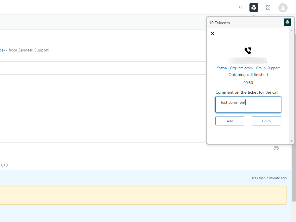Refresh your Zendesk page. The IPTelecom app icon shows at the top right hand corner.