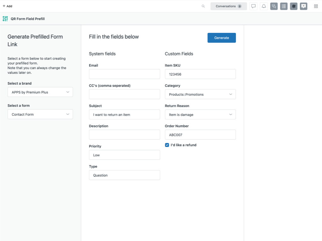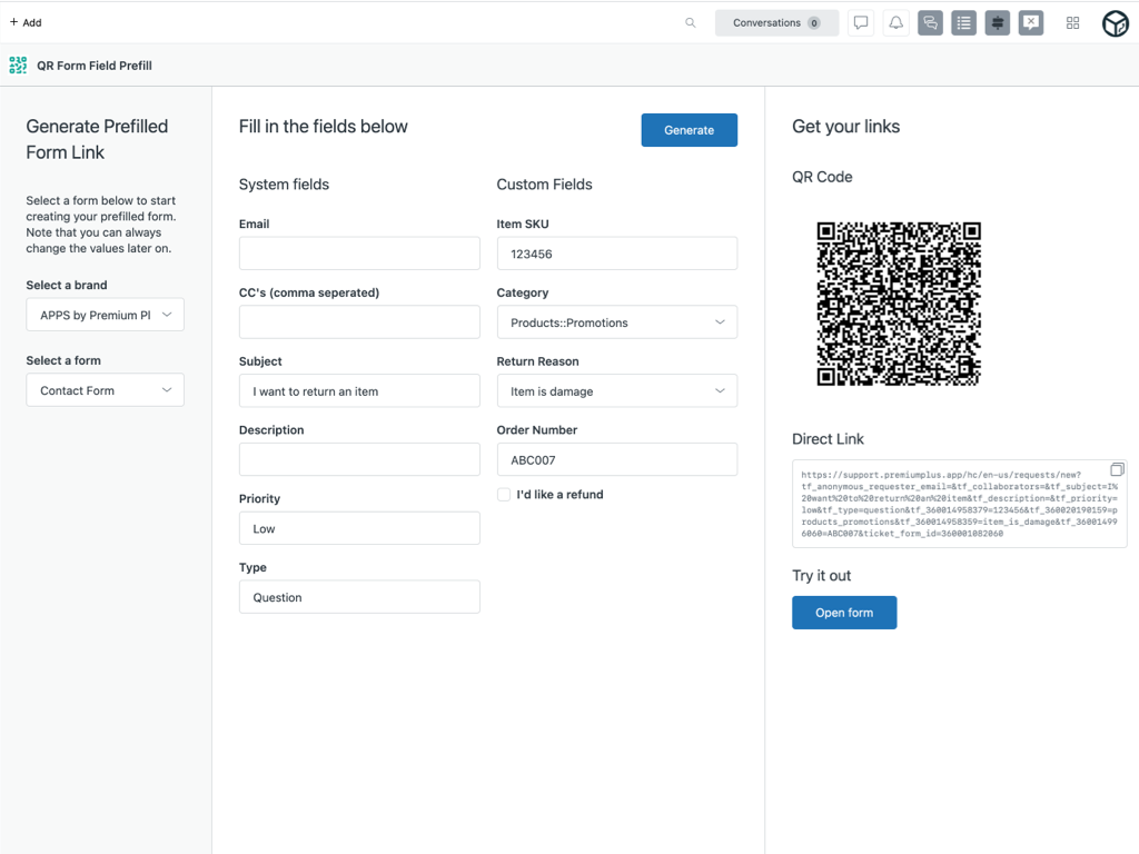 Automatically fill in Zendesk Guide webforms by scanning QR codes or clicking on pregenerated links.