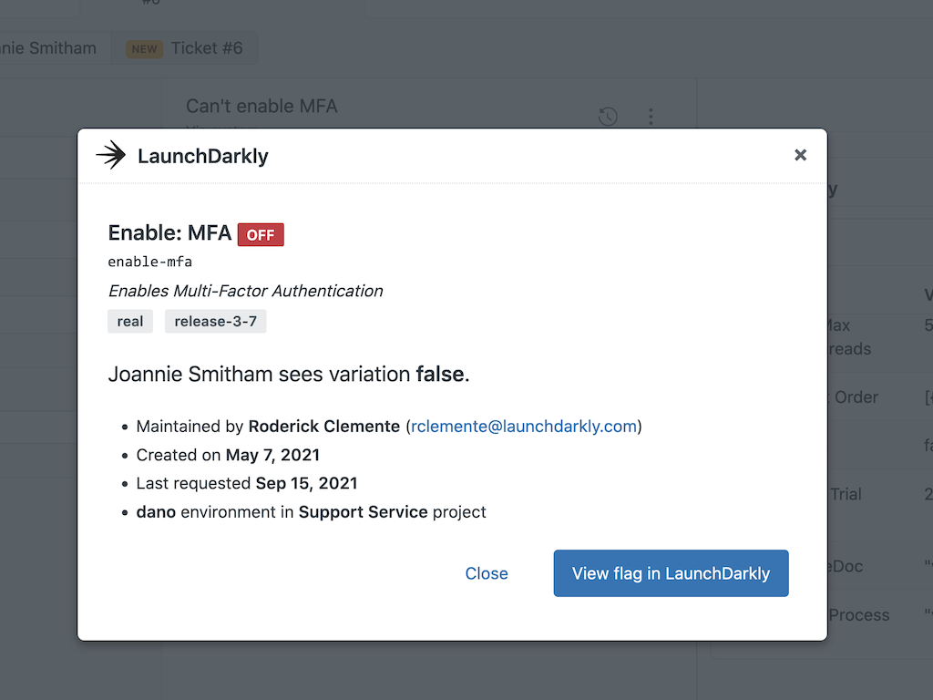 The LaunchDarkly app gives you and your team members a read-only view of your feature flags. Once installed, agents can see the flag variations LaunchDarkly serves to your customers without leaving Zendesk, thus dramatically shortening the time to close tickets. This app reduces administrative toil, boosts customer support productivity, and increases customer satisfaction.